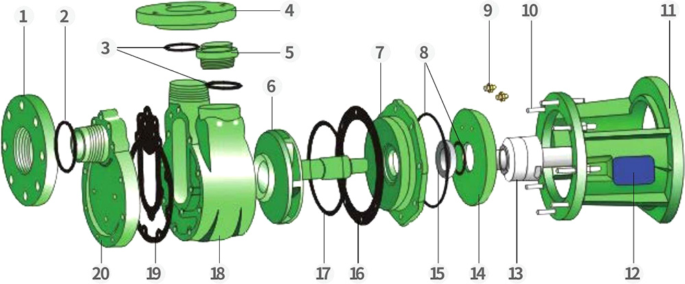 Unser Werk ist auf die Herstellung von korrosionsbeständigen Vollkunststoff-Kreisel- und selbstansaugenden Pumpen aus zwei Materialien – PVDF und FRPP – in vier Serien (FV, FP, FVZ, FPZ) spezialisiert. PVDF-Pumpen eignen sich für den Umgang mit starken Säuren, starken Oxidationsmitteln, Halogenen, aromatischen Kohlenwasserstoffen, aliphatischen Verbindungen und chlorierten Lösungsmitteln und haben einen Betriebstemperaturbereich von -40 °C bis 140 °C. FRPP-Pumpen eignen sich ideal für starke Laugen sowie allgemeine Säuren, Basen, Salze und deren Derivate und haben einen Betriebstemperaturbereich von -40 °C bis 90 °C. Der Antrieb der Pumpen erfolgt typischerweise durch energieeffiziente Y-Motoren. Auf Anfrage können auch explosionsgeschützte Motoren geliefert werden.